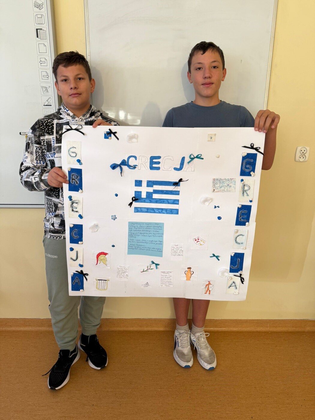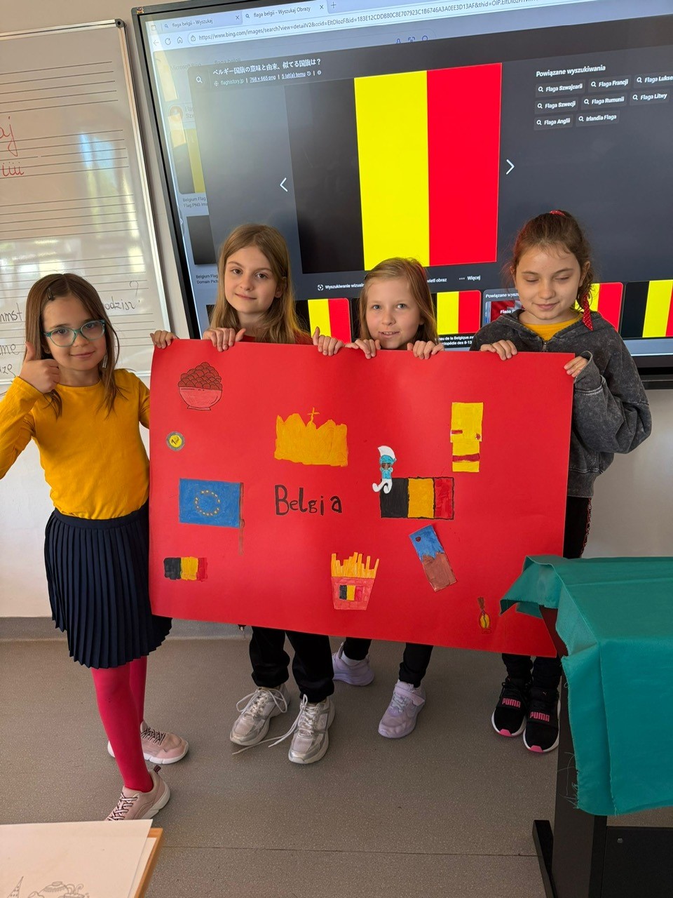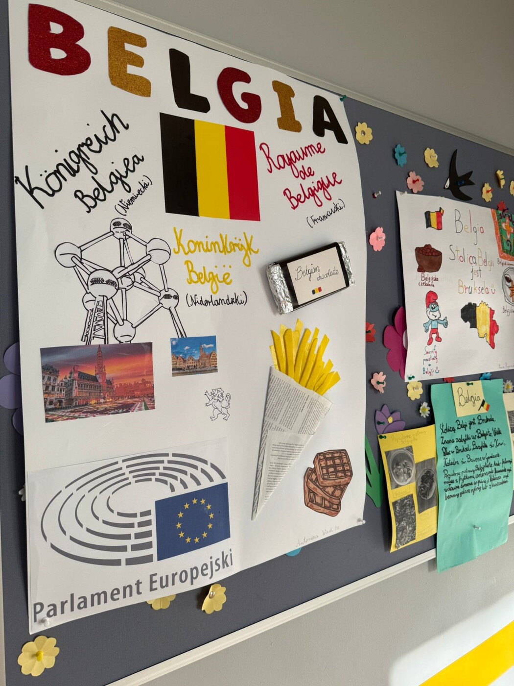 Uczniowie przyszli do szkoły ubrani w barwy wylosowanych państw europejskich, prezentując ich flagi i symbole. W klasach oraz na korytarzach można było podziwiać piękne dekoracje, w tym wyjątkową instalację ze słowem „pokój” zapisanym w wielu językach europejskich – symbol jedności i wzajemnego szacunku. Dzieci miały okazję kolorować flagi różnych państw, poznając ich historię i znaczenie. Dużym zainteresowaniem cieszyły się także quizy językowe, które sprawdzały znajomość europejskich języków oraz słownictwa. Uczniowie wykazali się dużą wiedzą, a przy tym świetnie się bawili!
