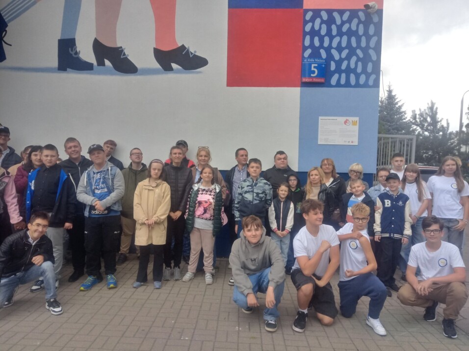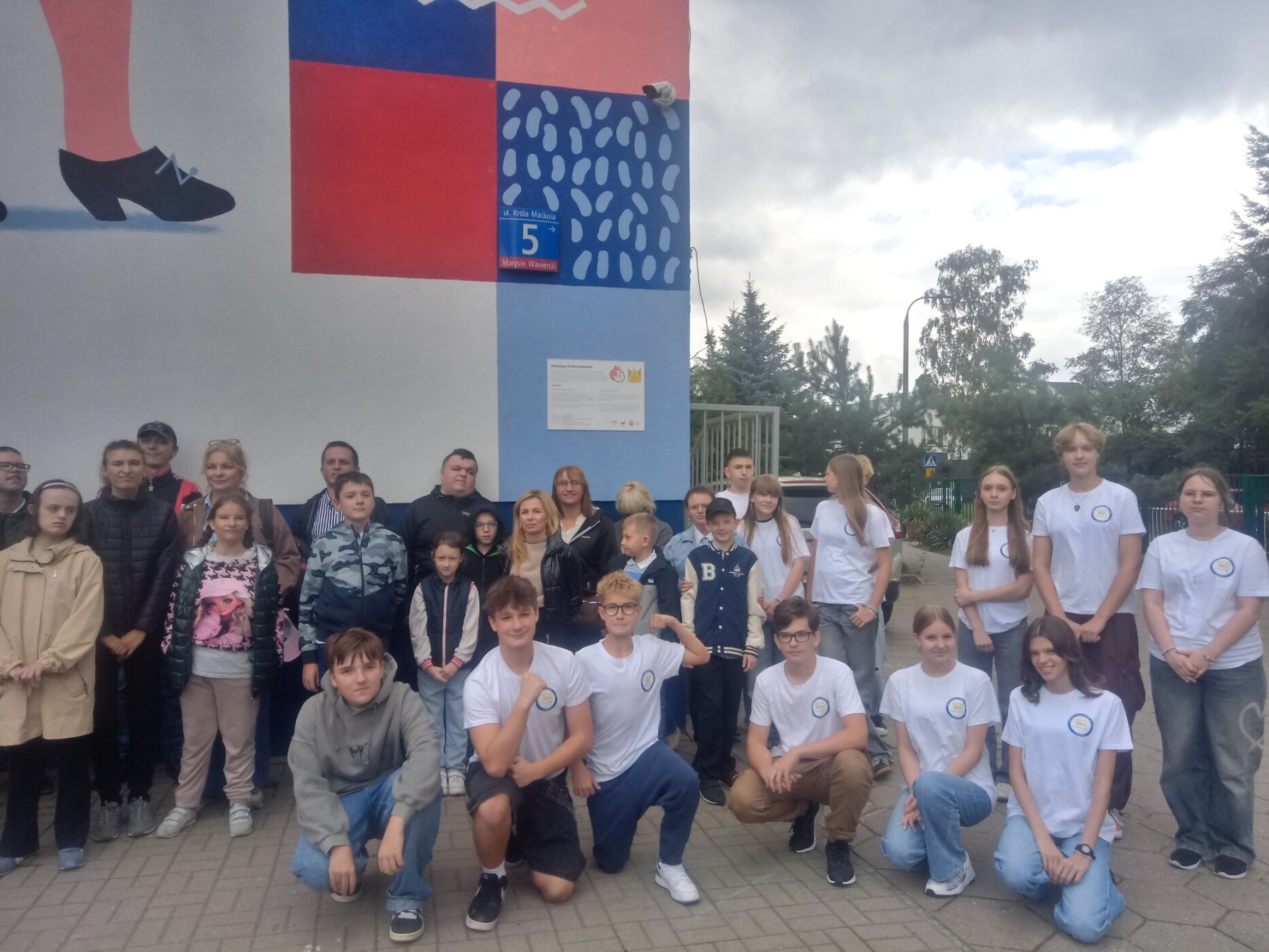 Wizytę zakończyło spotkanie przy muralu znajdującym się na ścianie budynku szkolnego, przedstawiającym Starego Doktora w otoczeniu dzieci.