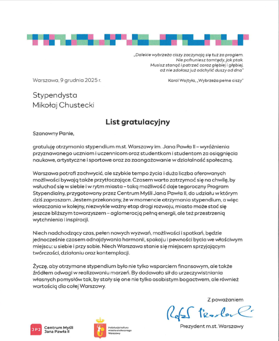 Uczeń klasy 5a naszej szkoły, Mikołaj Chustecki, otrzymał stypendium Jana Pawła II. To prestiżowe wyróżnienie przyznawane jest uczniom osiągającym wysokie wyniki w nauce oraz wykazującym się wzorową postawą. Serdecznie gratulujemy i życzymy dalszych sukcesów.