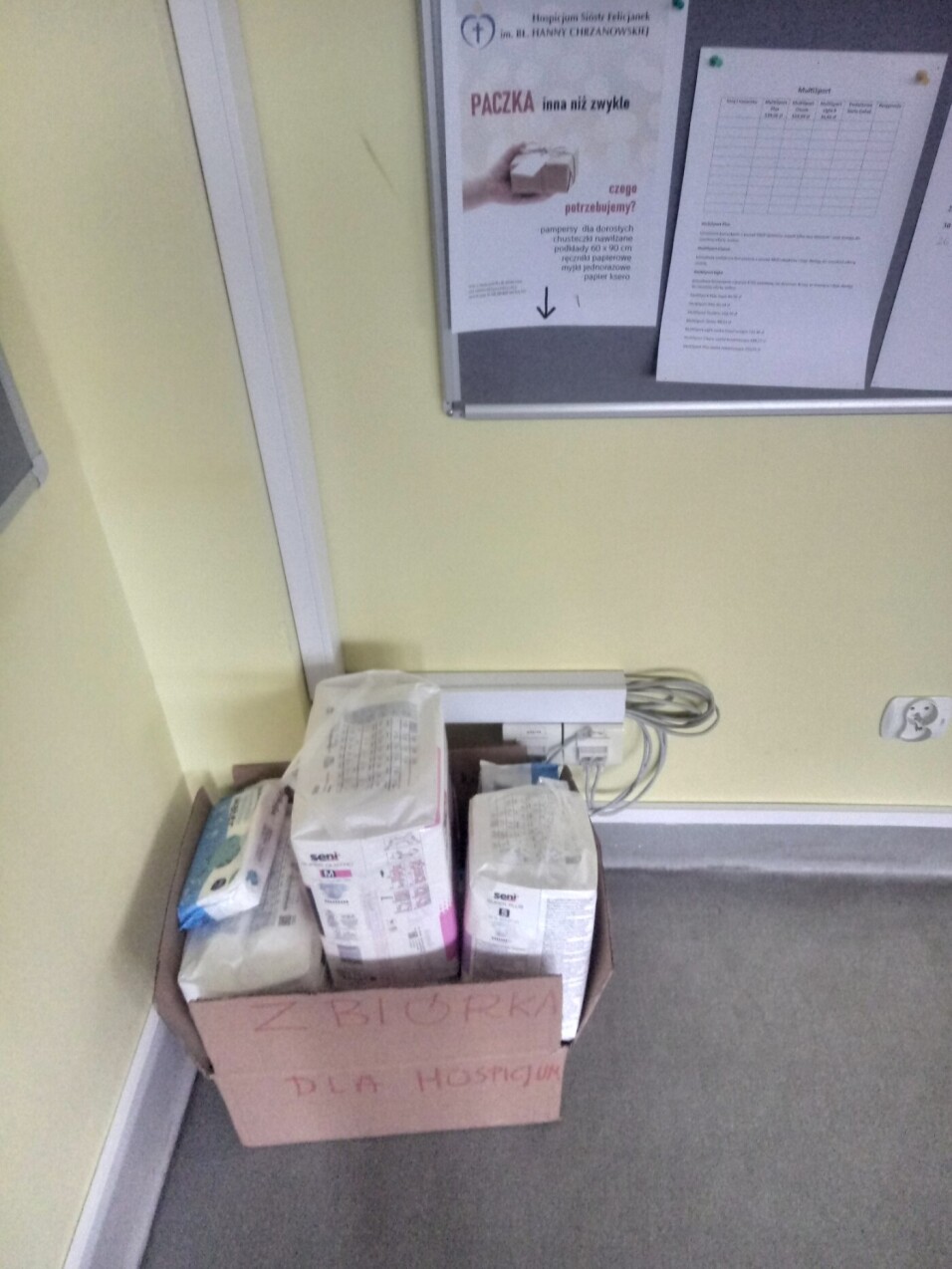 W tym miesiącu zbieraliśmy materiały higieniczne dla pacjentów Hospicjum Sióstr Felicjanek im. Bł. Hanny Chrzanowskiej , w Warszawie. Potrzeby hospicjum są olbrzymie, nas poproszono więc o przynoszenie pampersów, chusteczek nawilżanych, ręczników, myjek, podkładów oraz papieru xero.